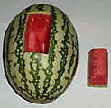 Externally, the fruit features smooth, deep green or yellow color thick exterior rind with light-green or gray colored vertical stripes all over its outer surface. Internally, its flesh is juicy, pink, red, or yellow with numerous small black seeds embedded in the middle-third portion of the flesh.